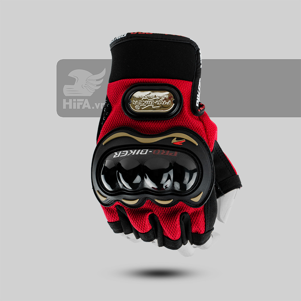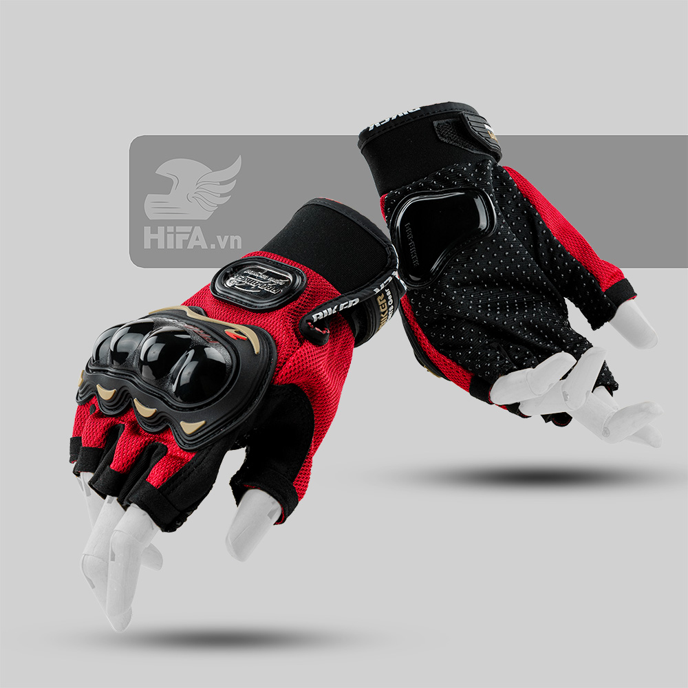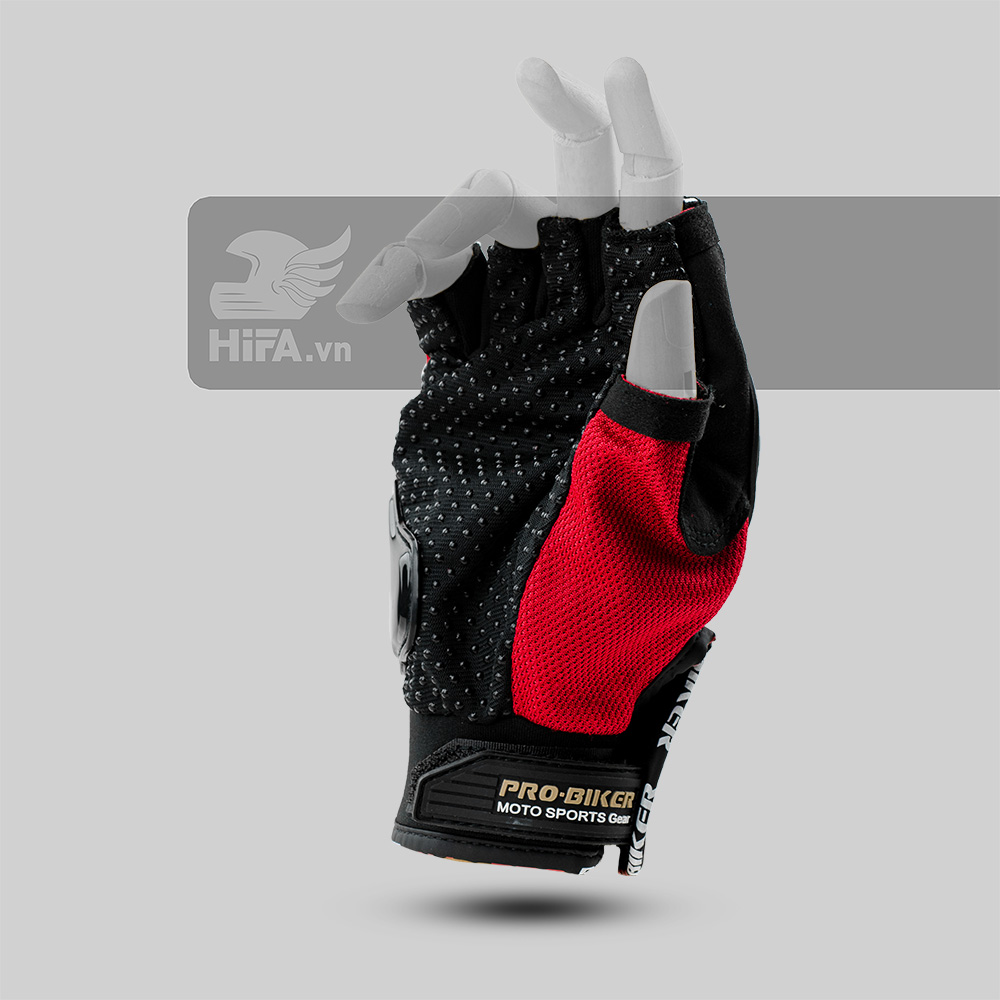 Găng tay Pro-Biker cụt ngón Đỏ được thiết kế dành cho người đi xe motor, xe gắn máy. Làm từ vải lưới Polyester thoáng mát. Phía trên có gù nhựa được làm từ nhựa PU, đệm nhựa dưới bàn tay và các hạt nhựa giúp tạo ma sát và cầm nắm dễ dàng hơn. Ngoài ra trên các ngón tay còn có các lỗ thông gió làm từ nhựa và lưới kim loại.