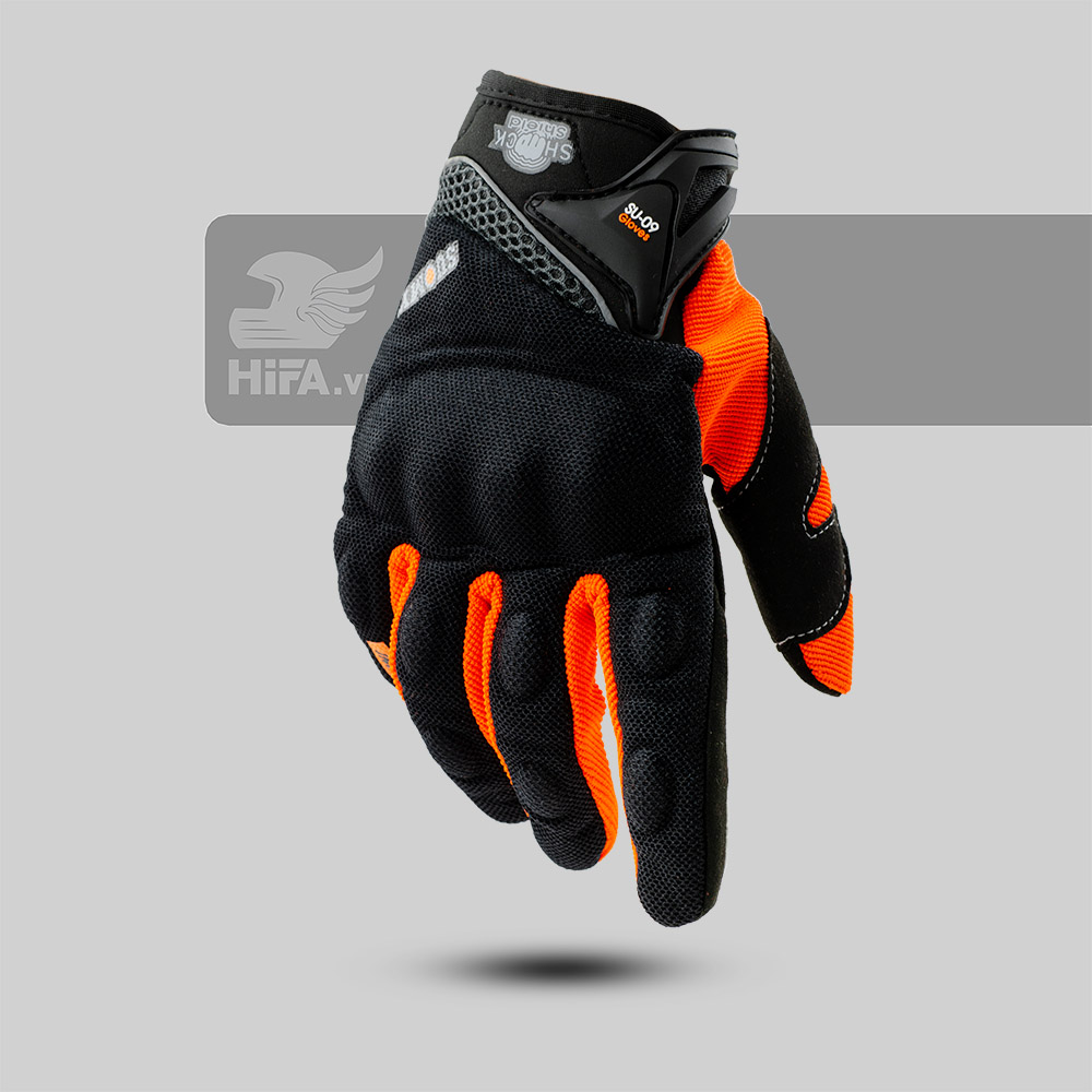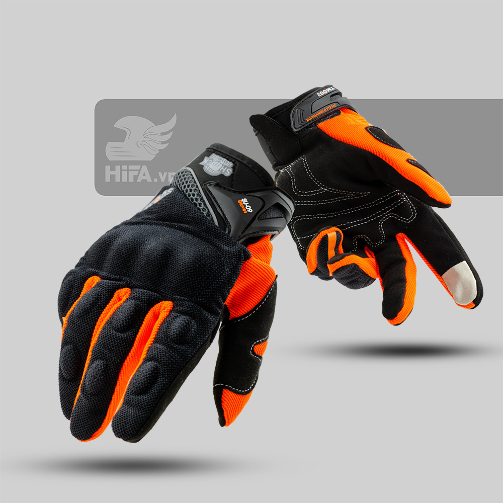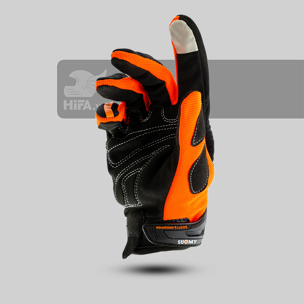 Găng tay SUOMY SU-09 dài ngón Đen Cam có đầu ngón tay sử dụng được điện thoại cảm ứng. Phía trên mu bàn tay có gù làm từ PU được bọc gọn gàng.