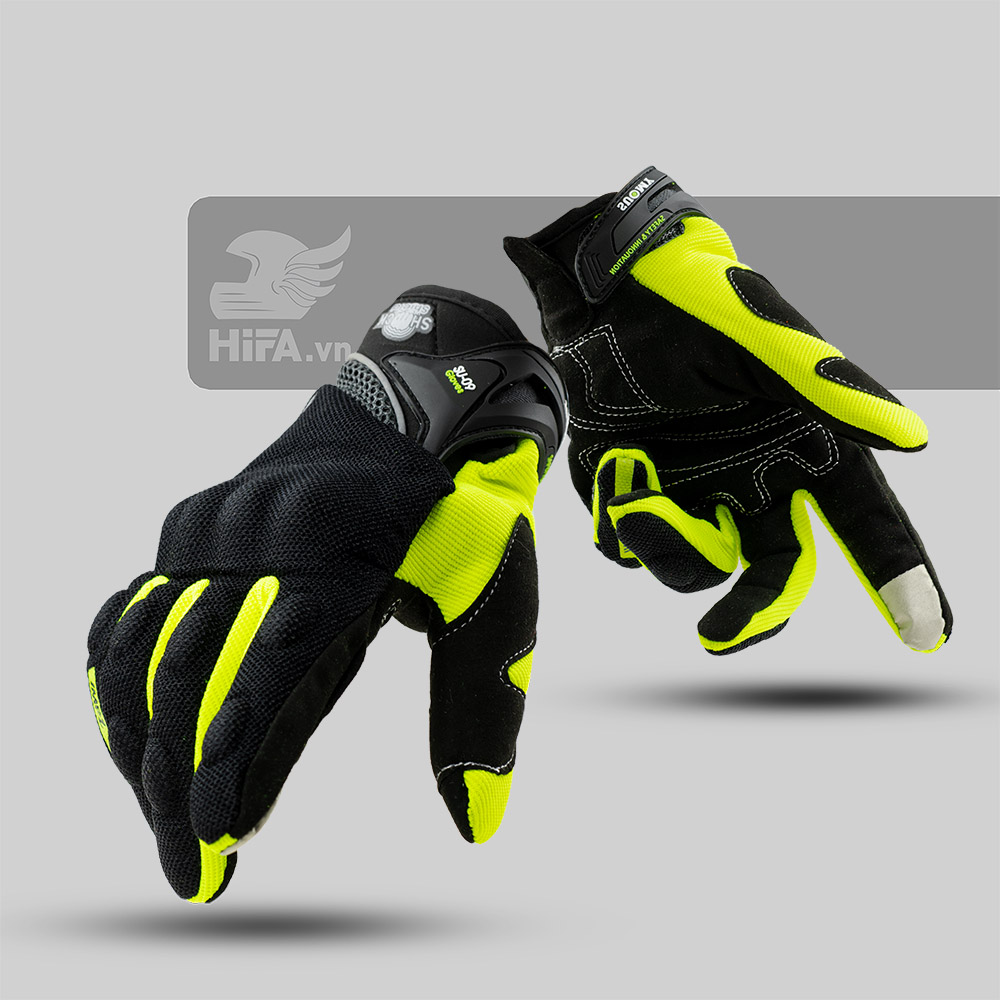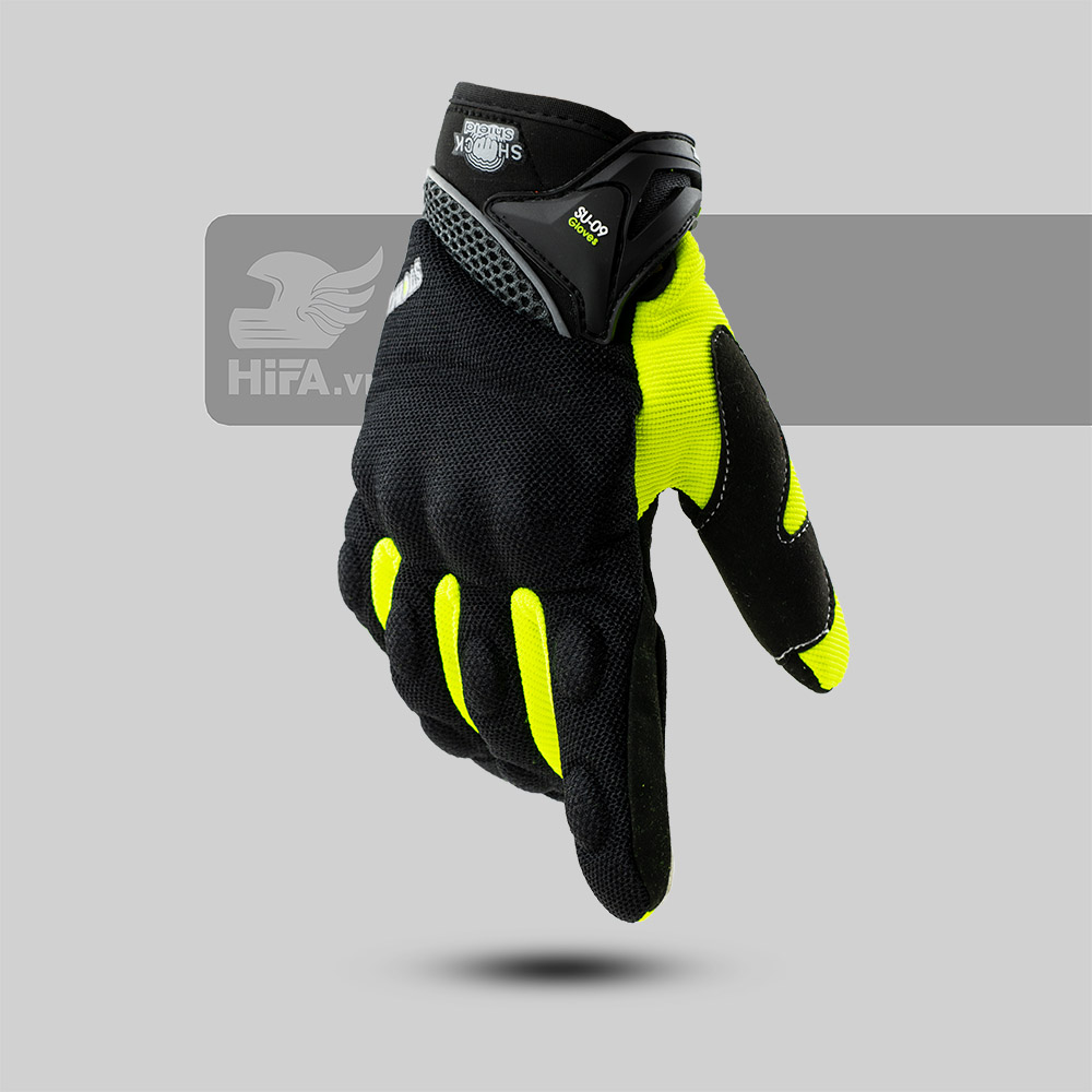 Găng tay SUOMY SU-09 dài ngón Đen Dạ Quang có đầu ngón tay sử dụng được điện thoại cảm ứng. Phía trên mu bàn tay có gù làm từ PU được bọc gọn gàng.