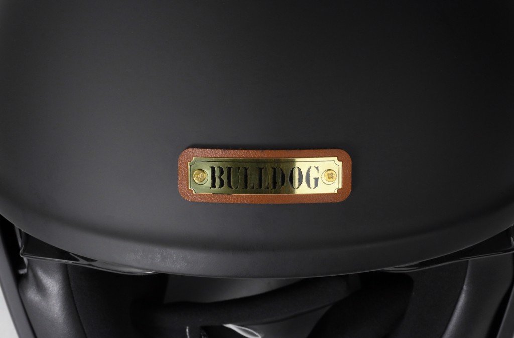 Logo mũ kim loại sáng bóng trên nền da cao cấp, đậm nét cổ điển của thương hiệu Bulldog.
