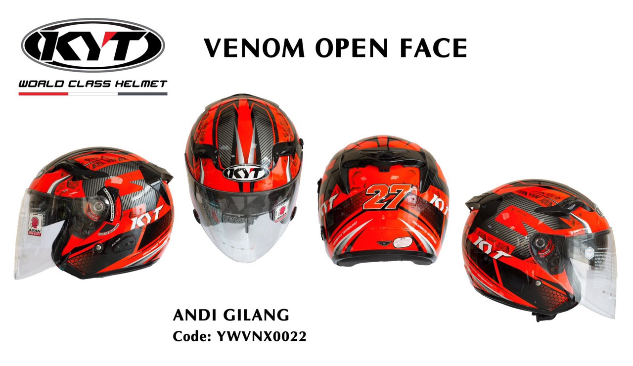 KYT Venom ANDI GILANG là thương hiệu được đông đảo các Biker biết tới là đơn vị tài trợ cho các giải đua Moto GP. Hãng cũng vừa cho ra mắt bộ sưu tập mũ bảo hiểm mới được lấy cảm hứng từ vũ trụ điện ảnh Marvel. Nếu bạn là một fan của Marvel hay đơn giản là một người muốn tậu cho mình một chiếc mũ bảo hiểm đáp ứng mọi nhu cầu về tính an toàn và thẩm mỹ thì KYT Venom chính là một lựa chọn đáng cân nhắc. Với form dáng vừa thể thao, cá tính vừa thanh thoát nhẹ nhàng cùng trọng lượng hợp lý và những tính năng an toàn khác.