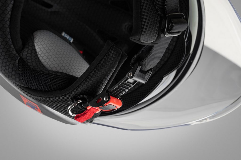 Phần vải đệm vân carbon, tạo cảm giác sang trọng. Khóa mũ được trang bị dạng khóa Micro lock, chịu lực cực tốt. Giới hạn lực tác động tối đa có thể lên đến 60kg. Thao tác đóng mở dễ dàng chỉ với một tay.