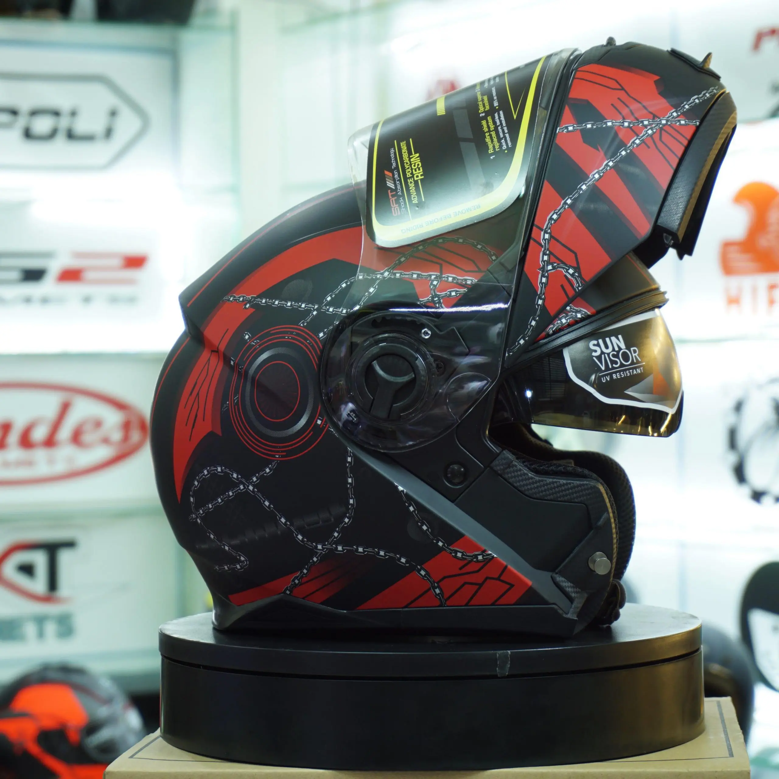 – Có 2 kính chống gió. Kính chống gió chính màu trong phù hợp cho phượt thủ có thể đi cả ngày lẫn đêm mà không bị cay mắt, hay bụi bay vào mắt. Kính tối bên trong giúp bảo vệ mắt người dùng trước cái nắng chói chang ban ng